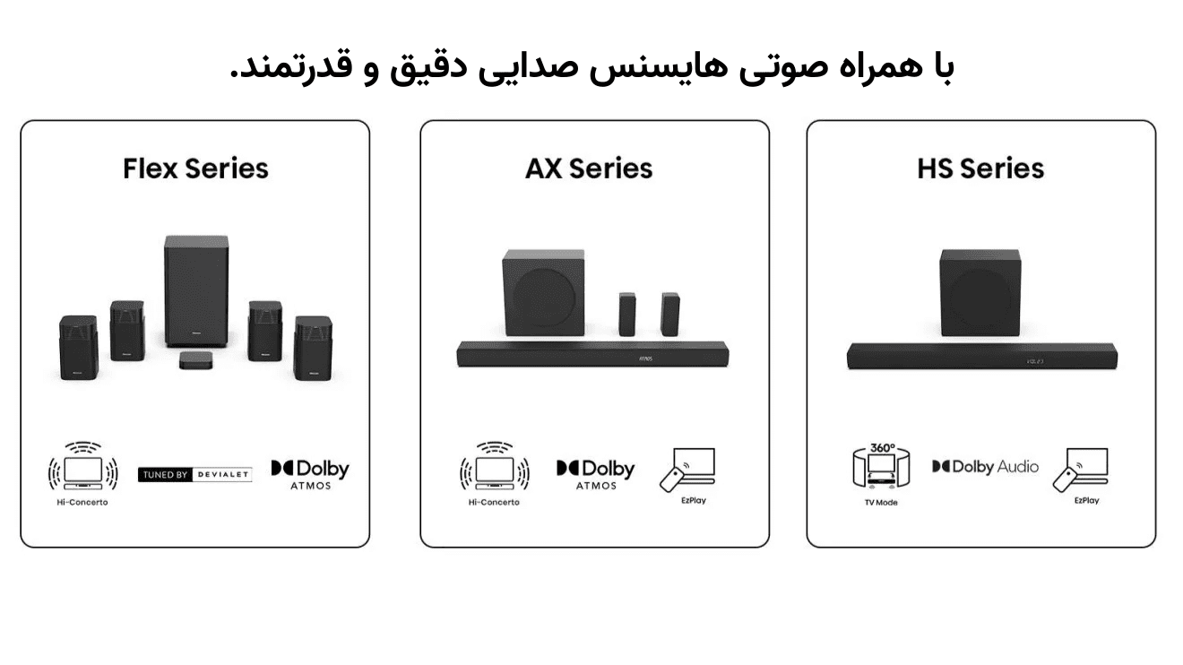 ویژگیهایی مثل Hi-Concerto Room Fitting Tuning و TV Mode تنها با مدلهای خاص تلویزیون و ساندبار هایسنس کار میکنند و تجربهای سفارشی و بهینهشده برای فضای خانه شما ایجاد میکنند. با Hisense TV Sound Companion، هماهنگی کامل بین صدا و تصویر را حس کنید و از تماشای فیلم، سریال و موسیقی با کیفیتی فراتر از انتظار لذت ببرید.