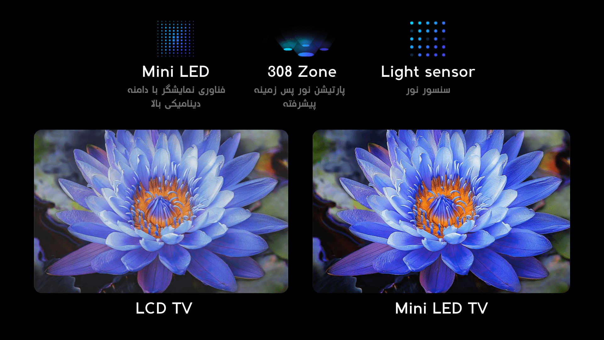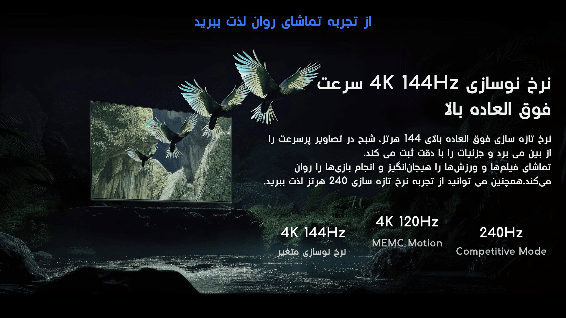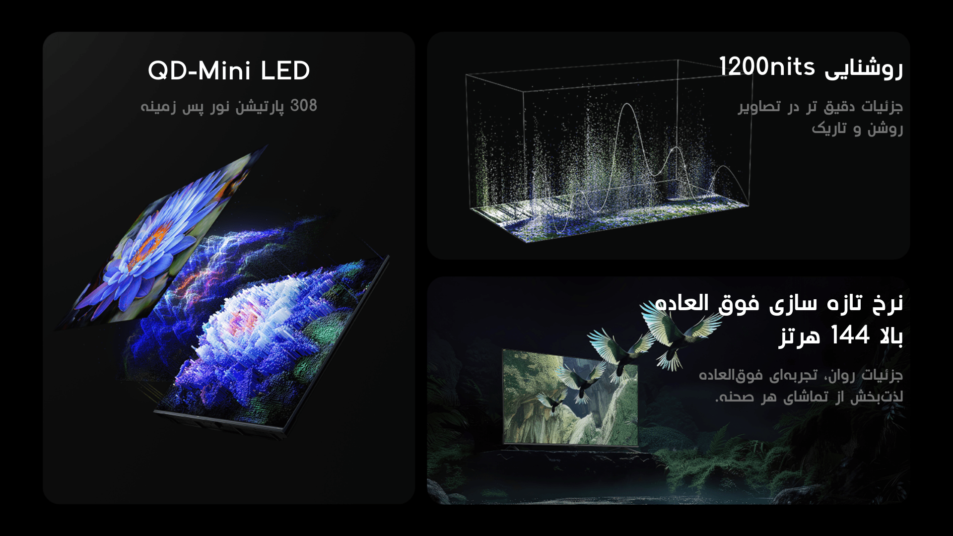 | پنل: “55 (QLED) 4K Mini LED | مشخصات پنل: 144Hz, 1200Nits, 2ms, Light Sensor |
