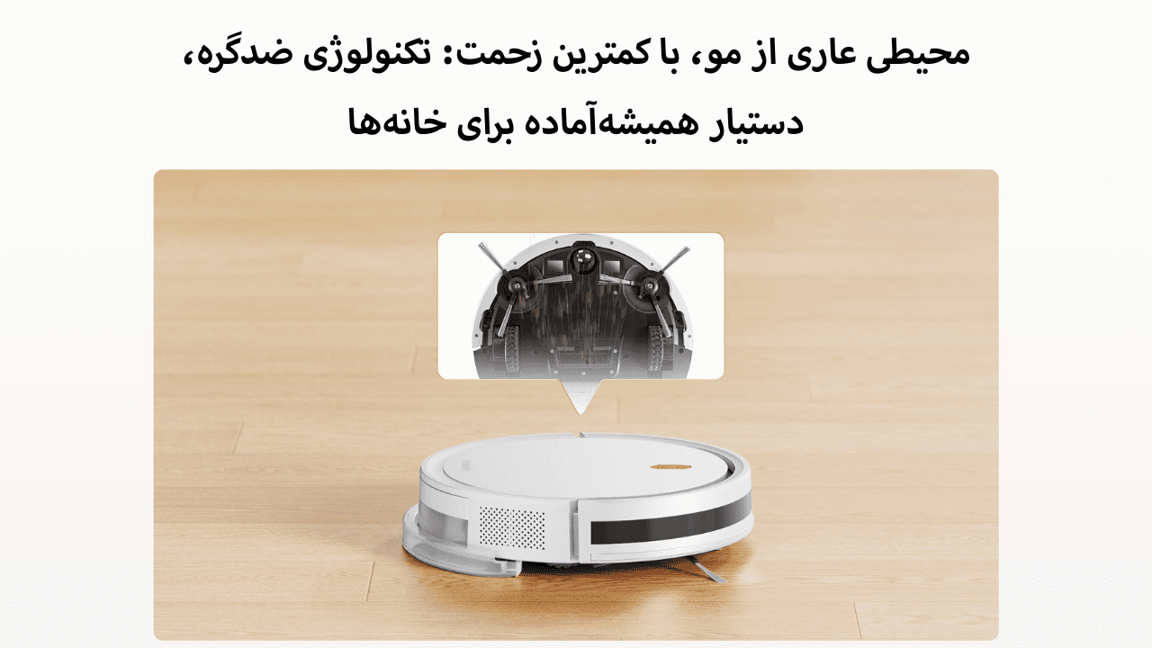 جارو رباتیک شیائومی مدل e5 با طراحی نازل پیشرفته و مقاوم در برابر گرهخوردن مو، بهطور ویژه برای خانههای دارای حیوانات خانگی طراحی شده است. این سیستم هوشمندانه از تجمع مو در برسها جلوگیری کرده و محیطی تمیز و عاری از مو را برای شما فراهم میآورد. دیگر نیازی به پاکسازی دستی موها از برس پس از هر بار استفاده نیست، چرا که جارو رباتیک هوشمند شیائومی e5 بهطور خودکار از این مشکل جلوگیری میکند.