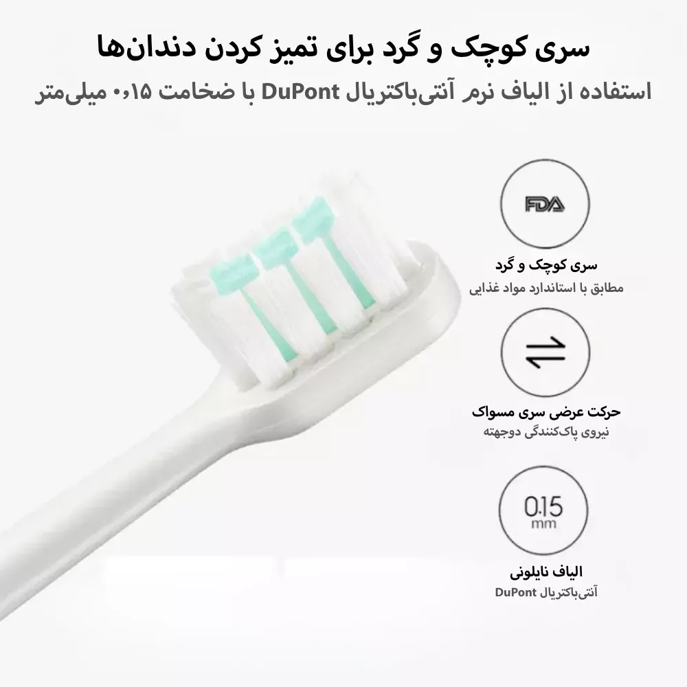سلامت لثهها اولویت اصلی این محصول است. سری مسواک T200 از الیاف باکیفیت DuPont ساخته شده که دارای پوشش ضد باکتری هستند. مهمتر از همه، نوک این الیاف کاملاً گرد شده (Rounded Bristles) تا از هرگونه خراشیدگی مینای دندان یا آسیب به لثههای حساس جلوگیری شود. این سری دارای تأییدیه سازمان غذا و داروی آمریکا (FDA) است که تضمینکننده ایمنی و بهداشت بالای آن میباشد. ترکیب این برسهای نرم با تکنولوژی لرزشی، پلاکهای دندانی را به شکلی مؤثرتر از مسواکهای دستی حذف میکند.