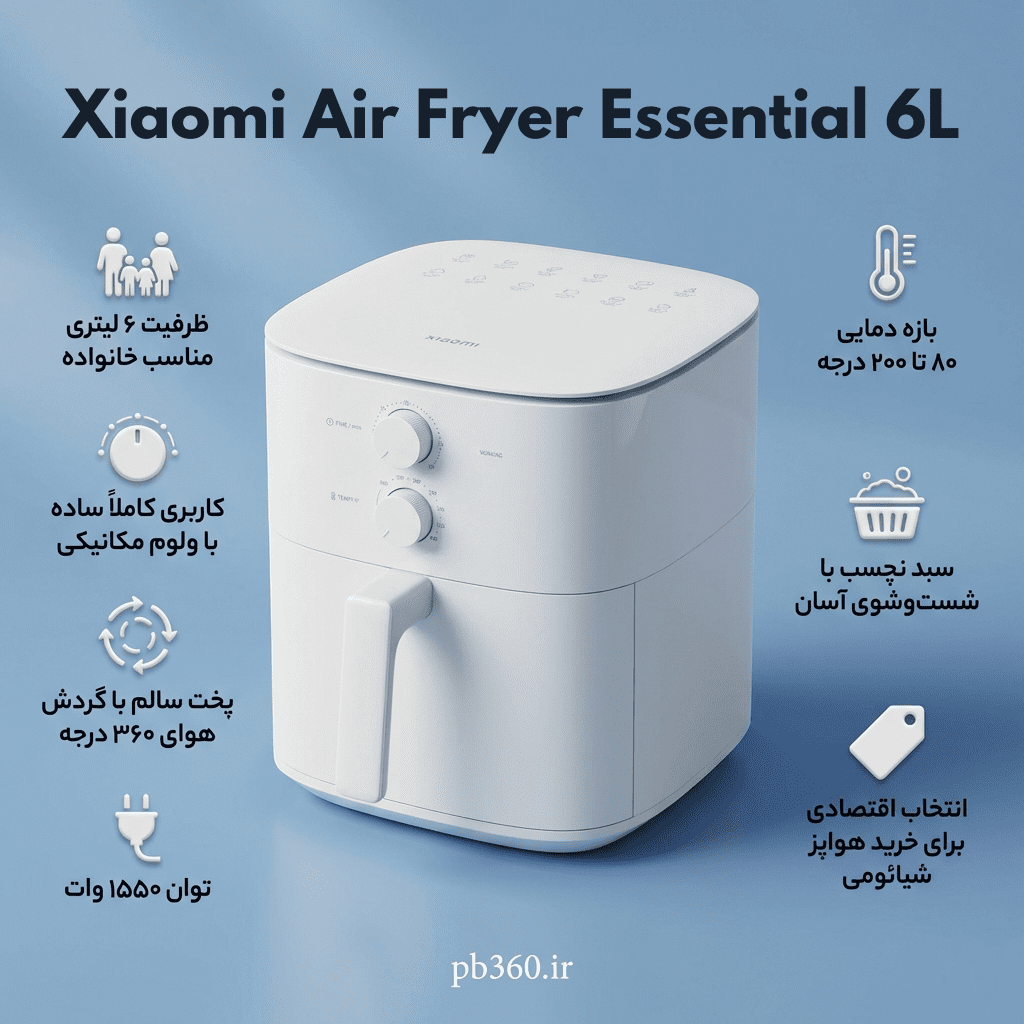تصور کن یک روز شلوغ کاری را پشت سر گذاشتی و شب فقط میخواهی بدون دردسر، یک غذای سالم و سریع آماده کنی. دقیقاً اینجاست که Xiaomi Air Fryer Essential 6L خودش را نشان میدهد. نه اپلیکیشن میخواهد، نه تنظیمات پیچیده؛ ولوم دما و زمان را میچرخانی و کار شروع میشود. همین سادگی، برای خیلیها بزرگترین مزیت است، مخصوصاً اگر هدفت استفادهی روزمره و بیدردسر از یک هواپز شیائومی باشد.