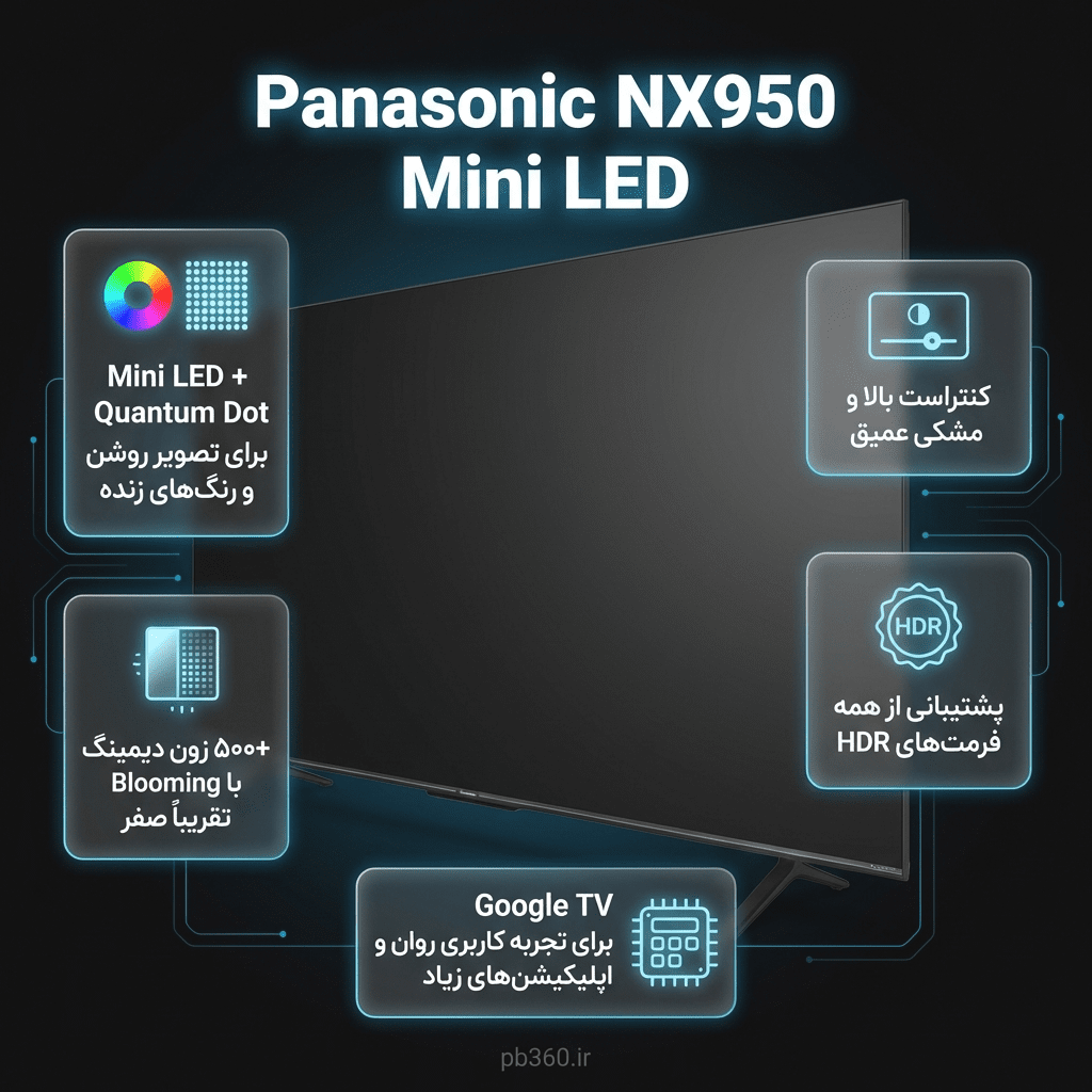 مدل Panasonic NX950 Mini LED دقیقاً همان نقطهای است که پاناسونیک دستش را رو میکند. این تلویزیون با ترکیب Mini LED و لایهی Quantum Dot ساخته شده تا بدون حرف اضافه، روبهروی پرچمداران سونی و سامسونگ بایستد. نتیجه؟ تصویری پرنور، عمیق و دقیق که هم برای تماشای حرفهای فیلم ساخته شده، هم برای کاربری که بهترین کیفیت تصویر سال ۲۰۲۶ را میخواهد، نه فقط عددهای تبلیغاتی.